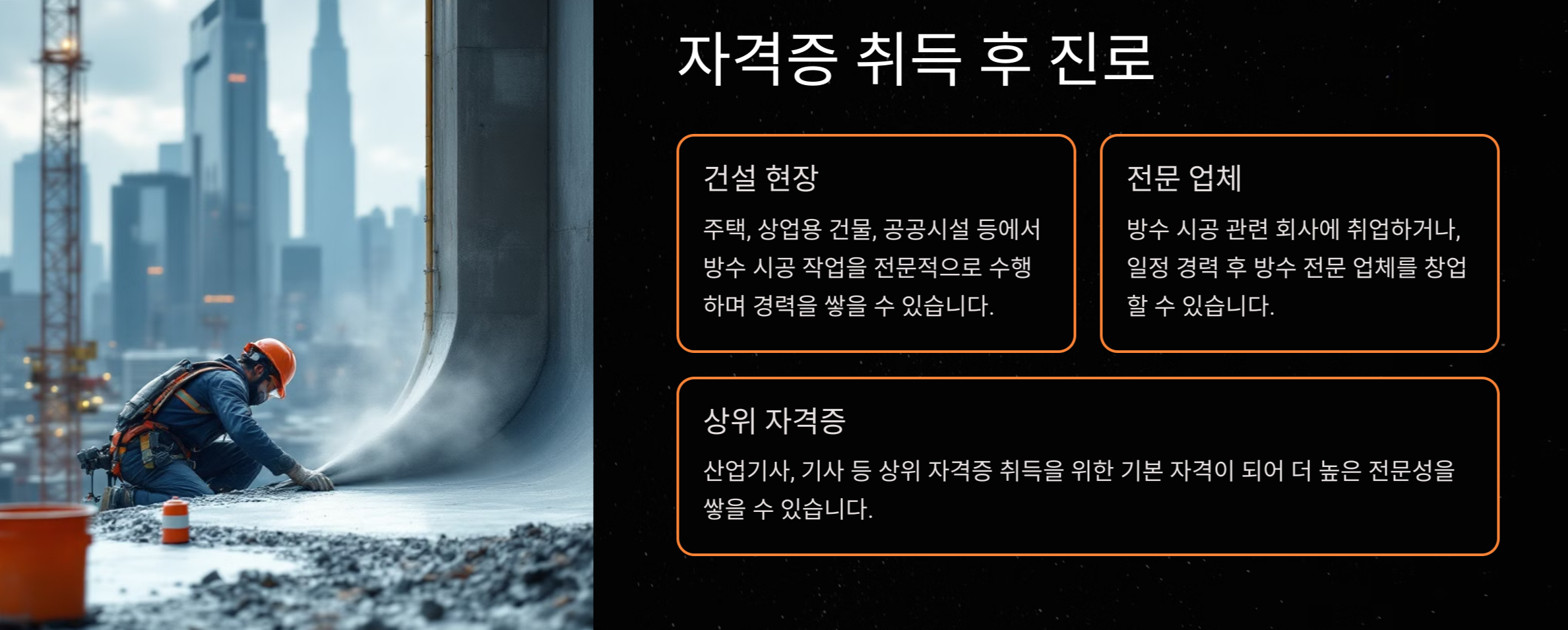 이 자격증을 취득하면 건설 현장에서 방수 시공 전문가로 활동할 수 있어요. 특히 건축, 토목, 플랜트 분야에서 방수 작업을 전문적으로 처리할 수 있는 능력을 인정받게 되죠. 건설 경기가 활발한 시기에는 더욱 인기가 높아지는 자격증이에요.