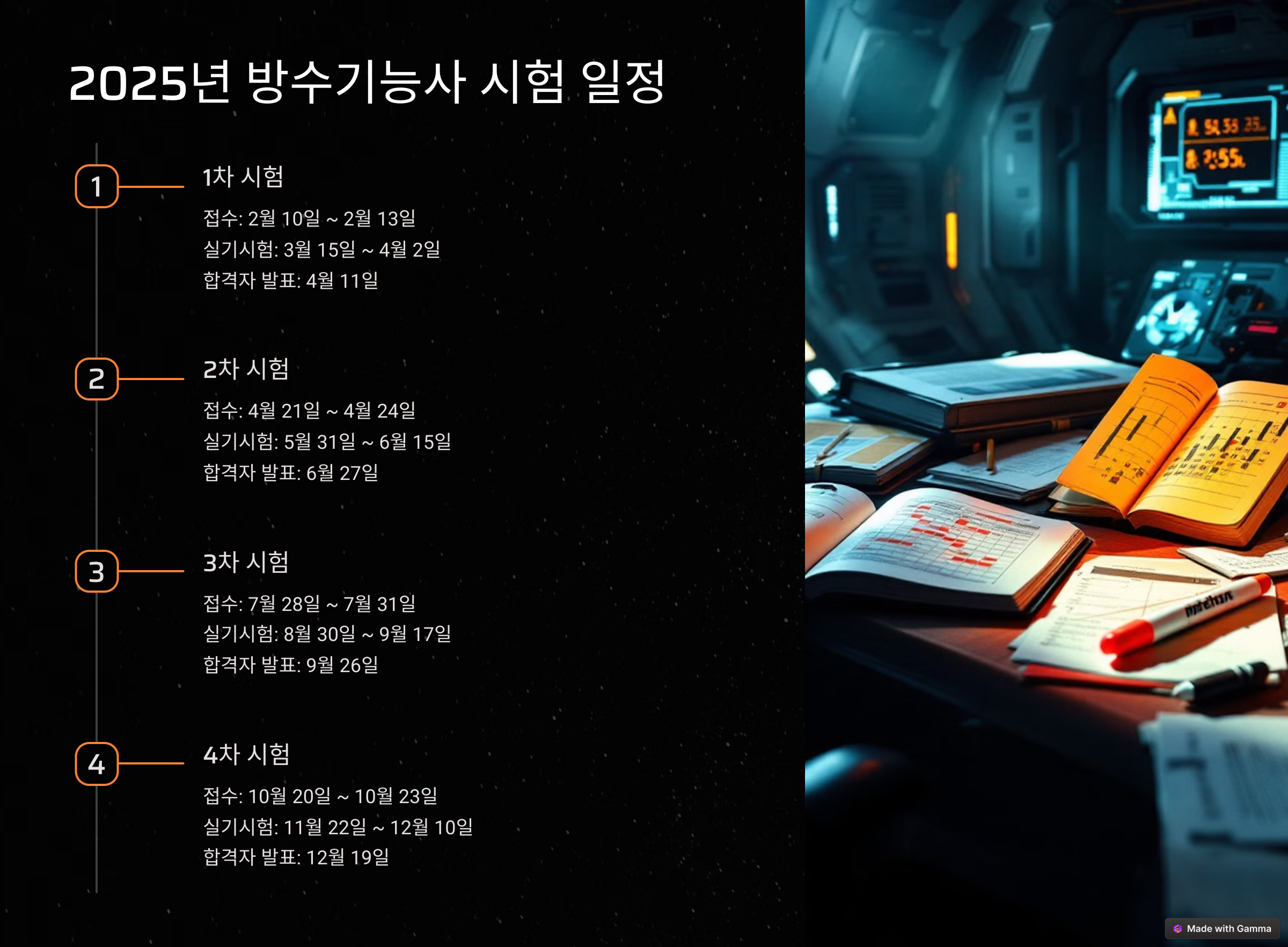 2025년 방수기능사 시험은 한국산업인력공단의 국가기술자격 시험 일정에 따라 진행돼요. 주로 연간 4회에서 5회에 걸쳐 실기시험이 시행되며, 지역별 시험 일정이 다를 수 있어요. 아래는 2025년의 주요 시험 일정입니다: