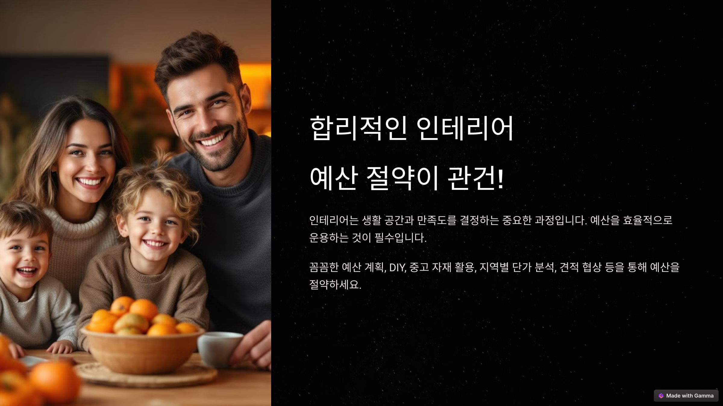 이번 가이드를 통해 합리적인 예산 설정, DIY와 전문가 시공 비교, 중고 자재 활용, 지역별 단가 분석, 견적 협상 등 인테리어 비용을 효과적으로 줄이는 다양한 방법을 배웠어요. 😊