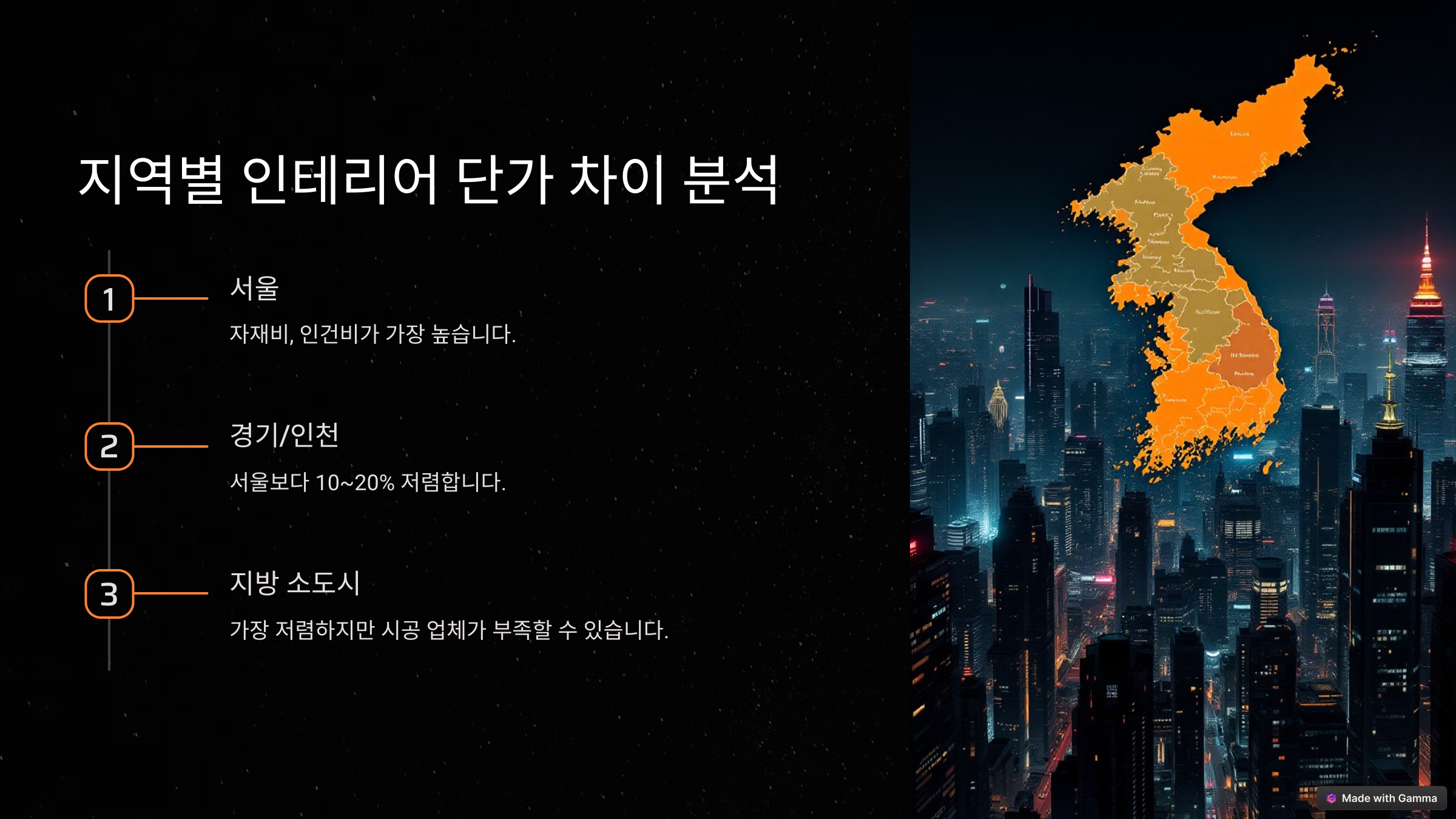 인테리어 비용은 지역에 따라 차이가 있어요. 같은 공사라도 서울, 수도권, 지방에 따라 시공 단가가 다를 수 있어요. 🏠💰