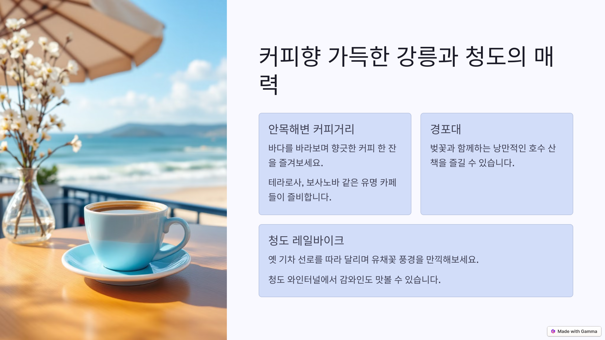 강릉은 봄에 가면 더욱 감성적인 여행을 할 수 있는 곳입니다. 안목해변의 커피 거리에서 바다를 바라보며 향긋한 커피 한 잔을 즐겨보세요. 또한 경포대와 오죽헌도 봄 기운을 만끽하기 좋은 명소입니다.