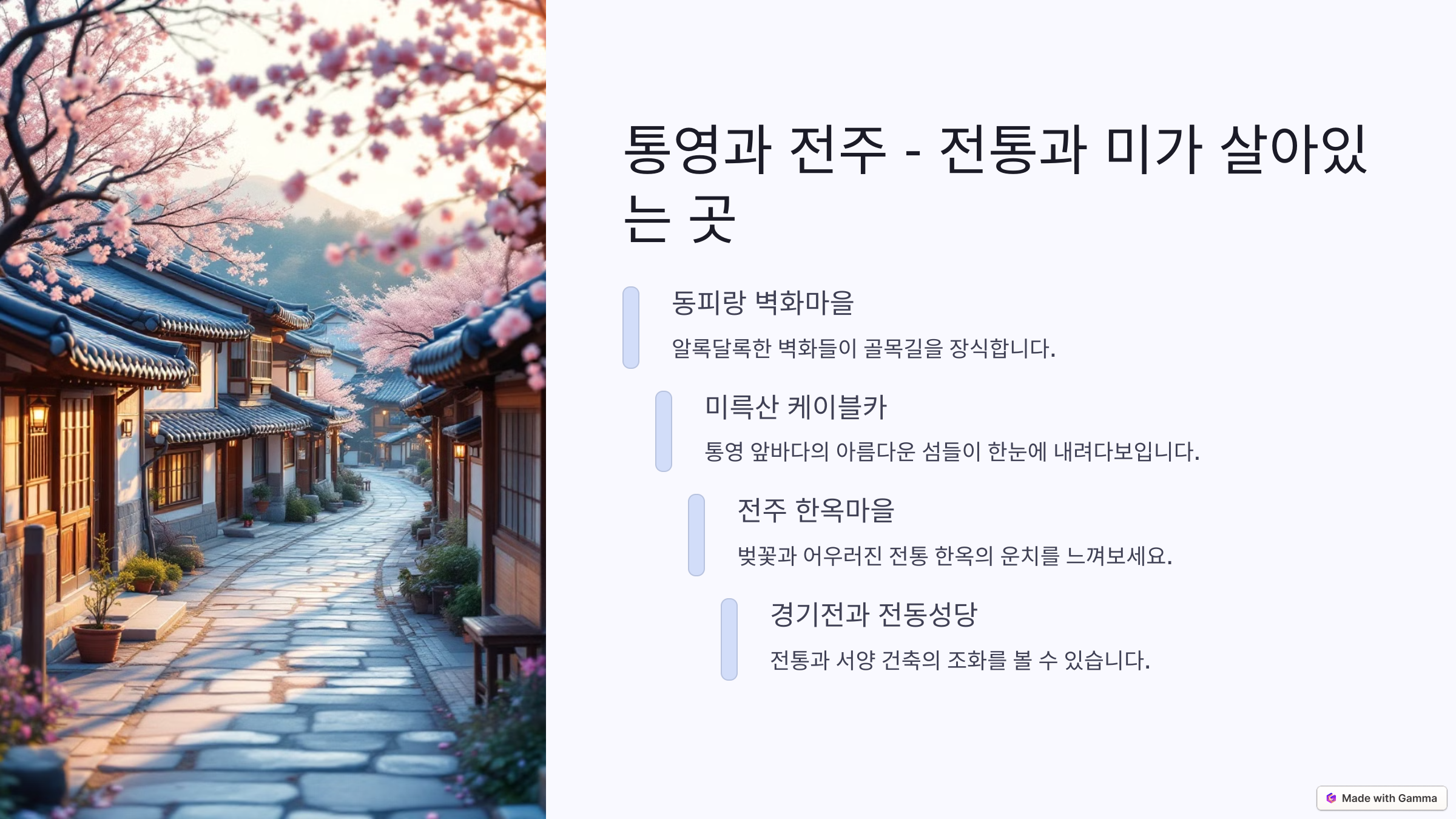 전주는 한국의 전통미를 가장 잘 느낄 수 있는 곳으로, 봄이 오면 더욱 운치 있는 분위기를 자아냅니다. 전주 한옥마을을 걸으며 전통 한옥의 고즈넉한 매력을 느껴보세요. 골목마다 벚꽃이 피어나 한옥과 어우러진 풍경이 인상적입니다.