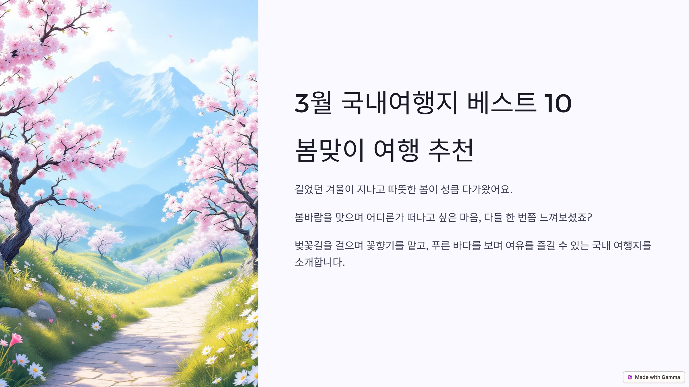 길었던 겨울이 지나고 따뜻한 봄이 성큼 다가왔어요. 봄바람을 맞으며 어디론가 떠나고 싶은 마음, 다들 한 번쯤 느껴보셨죠? 이번 3월, 벚꽃길을 걸으며 꽃향기를 맡고, 푸른 바다를 보며 여유를 즐길 수 있는 최고의 국내 여행지를 소개합니다.